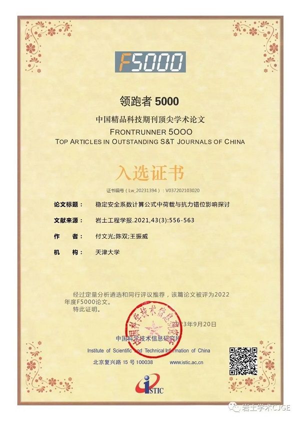中國科學技術(shù)信息研究所發(fā)布了《中國科技期刊引證報告2023年(核心版)》,其中,總工程師付文光2021年以第一作者發(fā)表在《巖土工程學報》的論文《穩(wěn)定安全系數(shù)計算公式中荷載與抗力錯位影響探討》,被評選為“中國精品科技期刊頂尖學術(shù)論文”(F5000)。